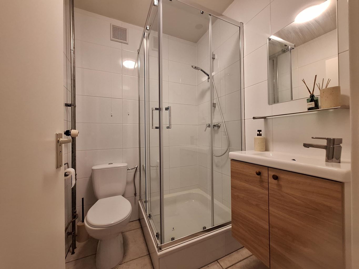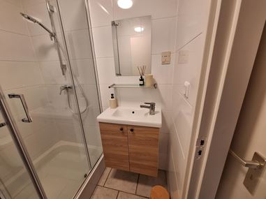 Through the cosy hallway, you enter the bright living room with open kitchen. The kitchen is fully equipped with a combination microwave oven, gas stove, refrigerator and sink, providing everything you need. The living room is furnished with modern, tidy furniture that creates a comfortable and fresh atmosphere.