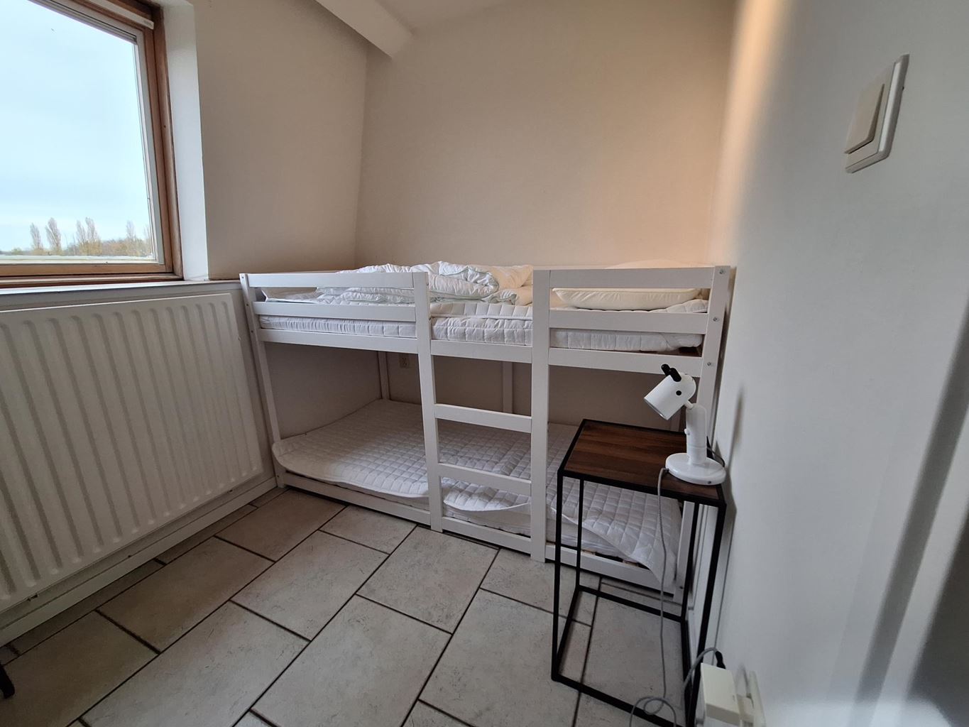 A small hallway leads to two bedrooms and the bathroom. The bathroom is neatly finished and equipped with a shower, toilet and washbasin with cabinet. One bedroom features a double bed, while the other is furnished with a practical bunk bed. From the bedrooms, you can enjoy a calming view, adding to the overall pleasant ambiance.