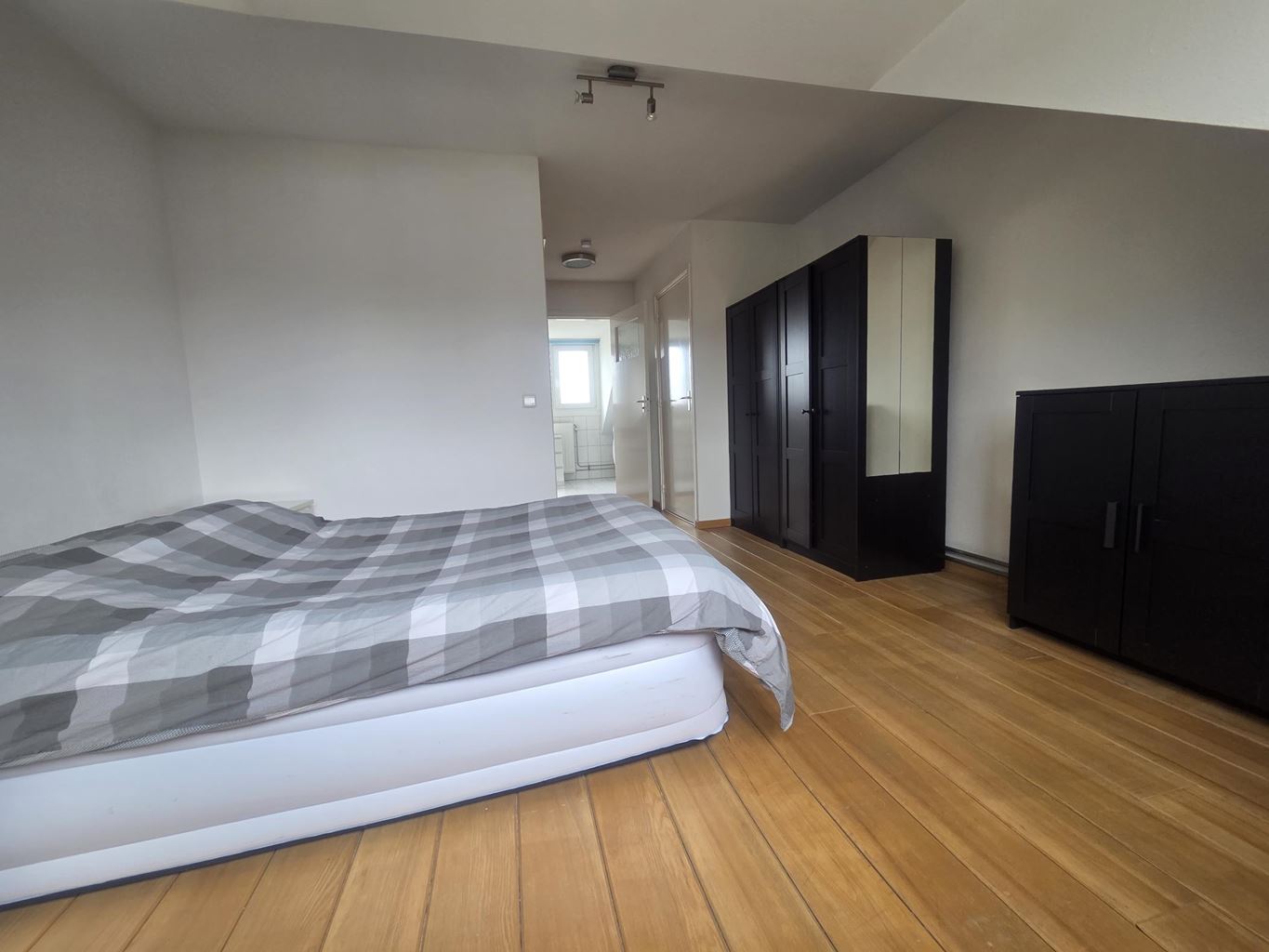 The bedroom also features a dormer window, providing additional space and pleasant natural light. The attractive wooden floor gives the room a warm and well-maintained appearance, making it a perfect place to relax.