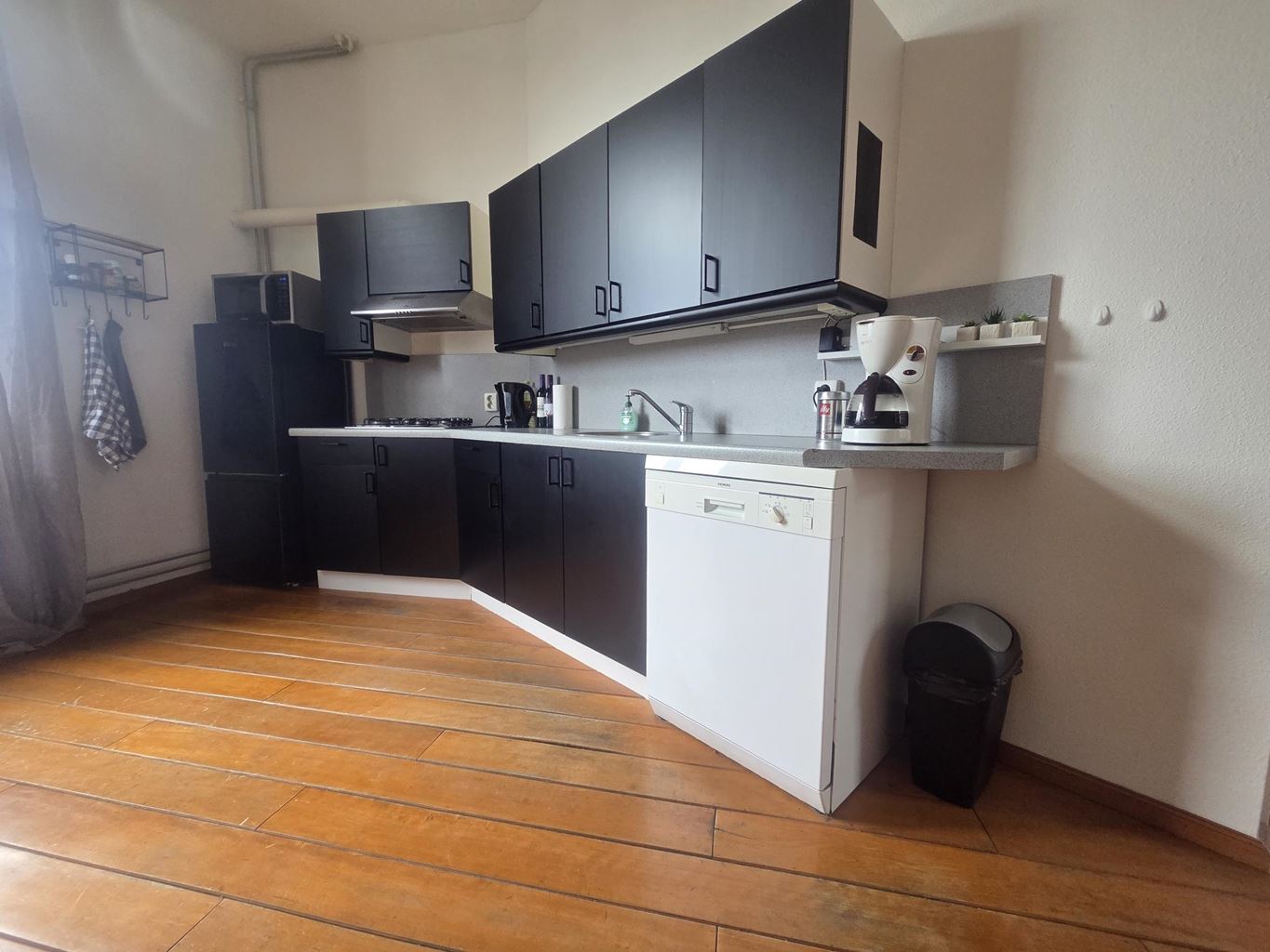 The open kitchen seamlessly connects to the living area and features a modern dark kitchen setup. It is fully equipped with a dishwasher, sink, extractor hood, 4-burner gas stove, refrigerator with freezer compartment, and a microwave.