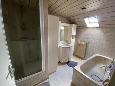There are two bedrooms on the first floor. The bedroom at the front of the house (20 m²) has a large built-in wardrobe. The second bedroom (14 m²) is located at the rear of the house and offers a view of the garden.