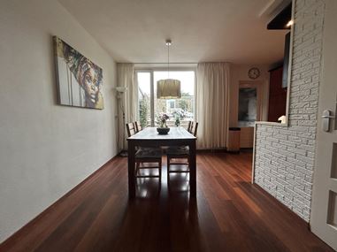 Entrance / hall with meter cupboard, Via 3-steps is the cozy living room with sitting area and fireplace. The dining room with half open kitchen is the extension of the living room. The living and dining room has a beautiful oak wooden floor. Through a small hall where the guest toilet is located, the stairs to the 1st floor is accessible. The semi-open kitchen is equipped with the following equipment: hood, 4-burner gas stove, oven, dishwasher and refrigerator. From the kitchen you have access to the pantry where an extra fridge and freezer is placed and the facilities for white goods. Through the utility room you can access the fully enclosed garden with a nice terrace and storage for wood and behind by the access to the garage and back.
