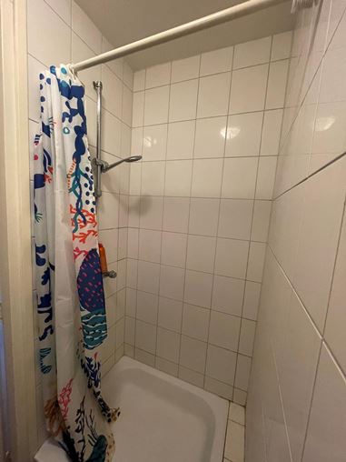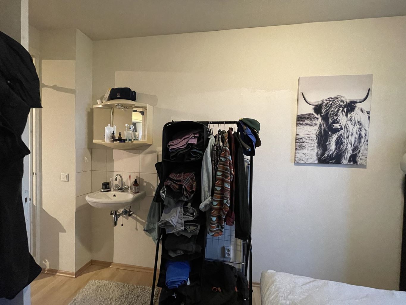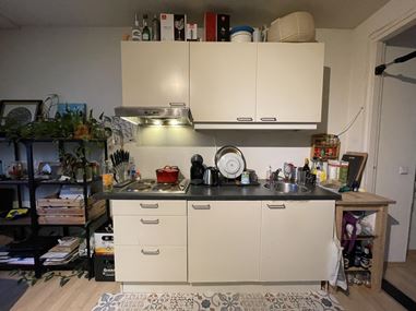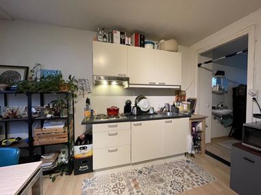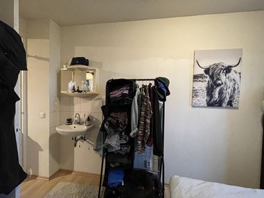 The apartment on the second floor has a bright living room with laminate flooring and an open kitchen, equipped with a refrigerator with freezer compartment, extractor hood, and 4-burner electric hob. The bathroom has a shower and toilet. At the rear is the bedroom, also with laminate flooring and a sink. There is also a communal outdoor area and bicycle storage. Internet and telephone connections are available.