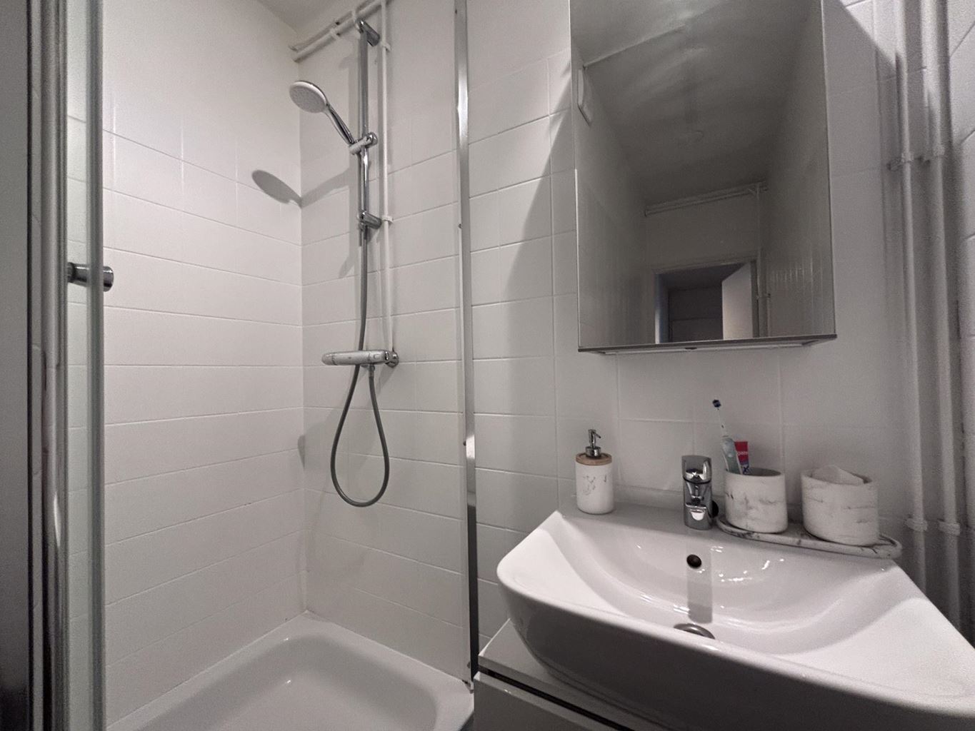 The bathroom is fitted with a shower and washbasin. The separate toilet with a small sink is accessible from the hallway.