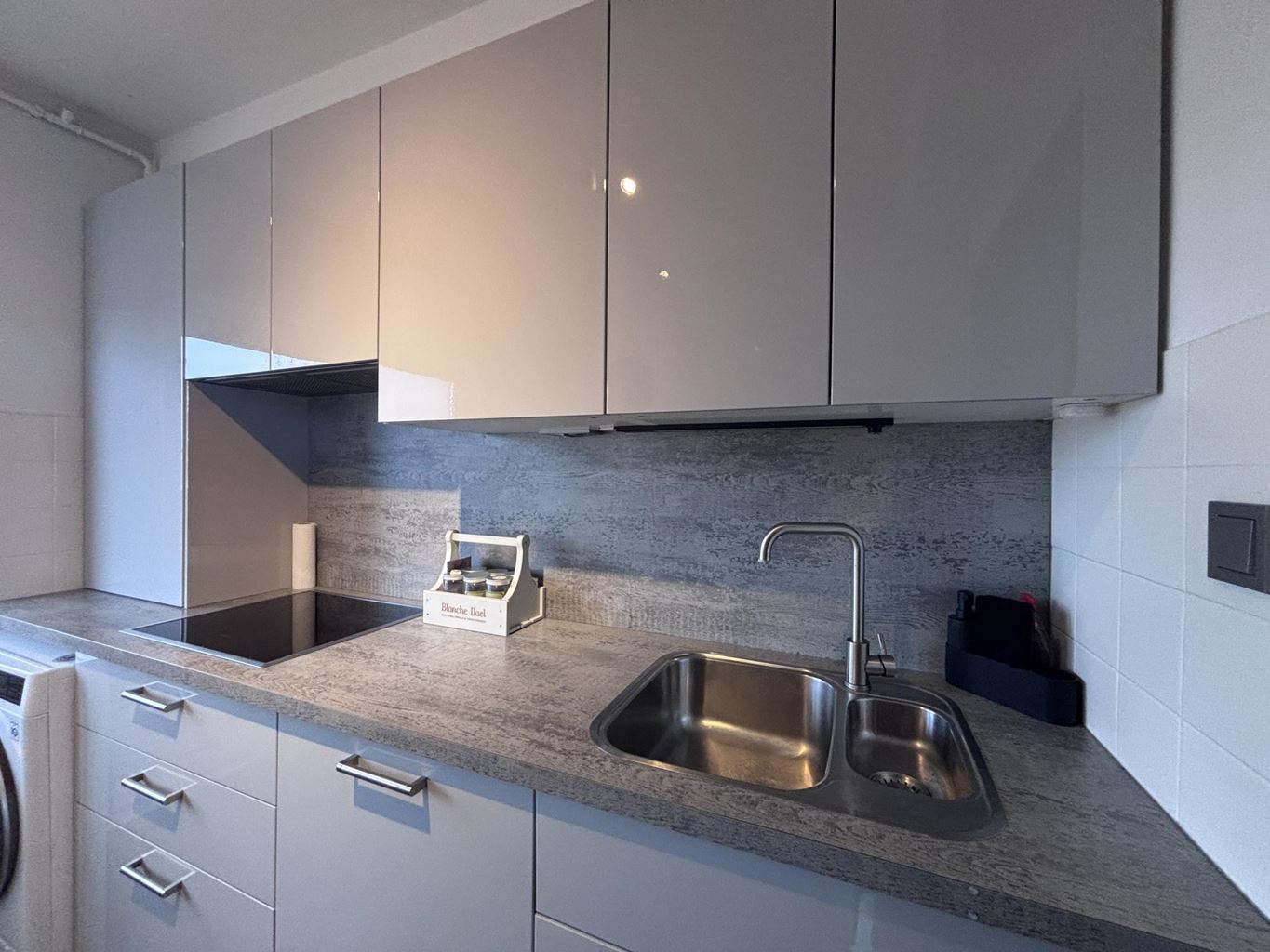 The separate kitchen is practically designed and equipped with various built-in appliances, including a four-burner induction hob, oven, extractor hood, dishwasher, and a tall fridge-freezer combination. The second balcony can be accessed from the kitchen.