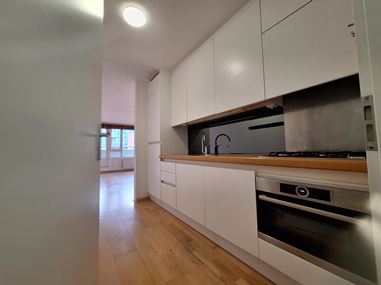 Through the hallway you enter the spacious and bright living room, featuring laminate flooring, air conditioning and direct access to the largest balcony. The open kitchen is fully equipped with an extractor hood, 4-burner gas hob, combi oven, refrigerator and freezer; the laundry area with washing machine connection is also located here.