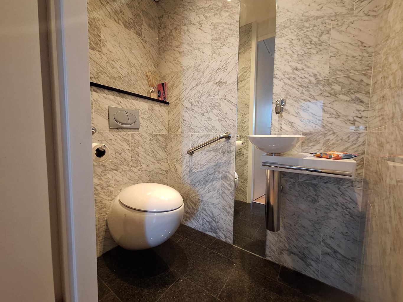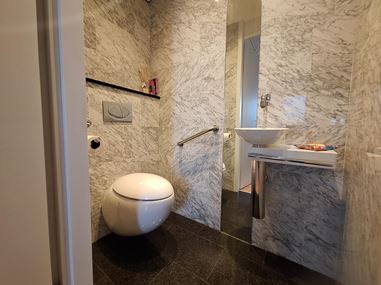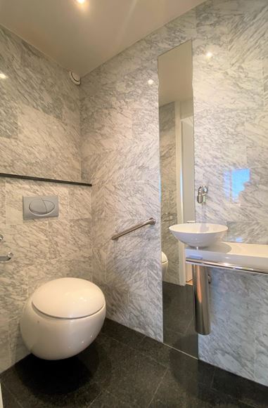 The modern bathroom is fitted with a walk-in shower and a fixed washbasin, while the separate toilet includes a small hand basin. All sanitary fittings are finished in stylish Italian design by the brand Alessi.