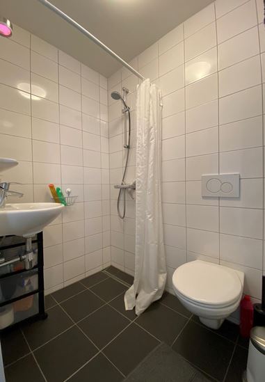 The room has its own private entrance and consists of a living/sleeping area. The kitchenette is equipped with an extractor hood, sink, 2-burner electric stove, and a fridge with freezer compartment. The bathroom includes a shower, sink, and toilet.