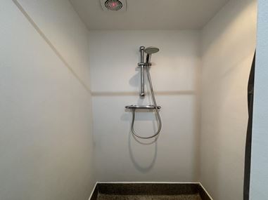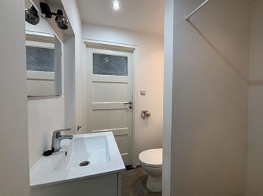 De badkamer is centraal in de woning gelegen tussen de hal en de slaapkamer en is vanuit beide ruimtes toegankelijk. De badkamer beschikt over een nette afwerking en is voorzien van een ruime douche, wastafel en toilet.