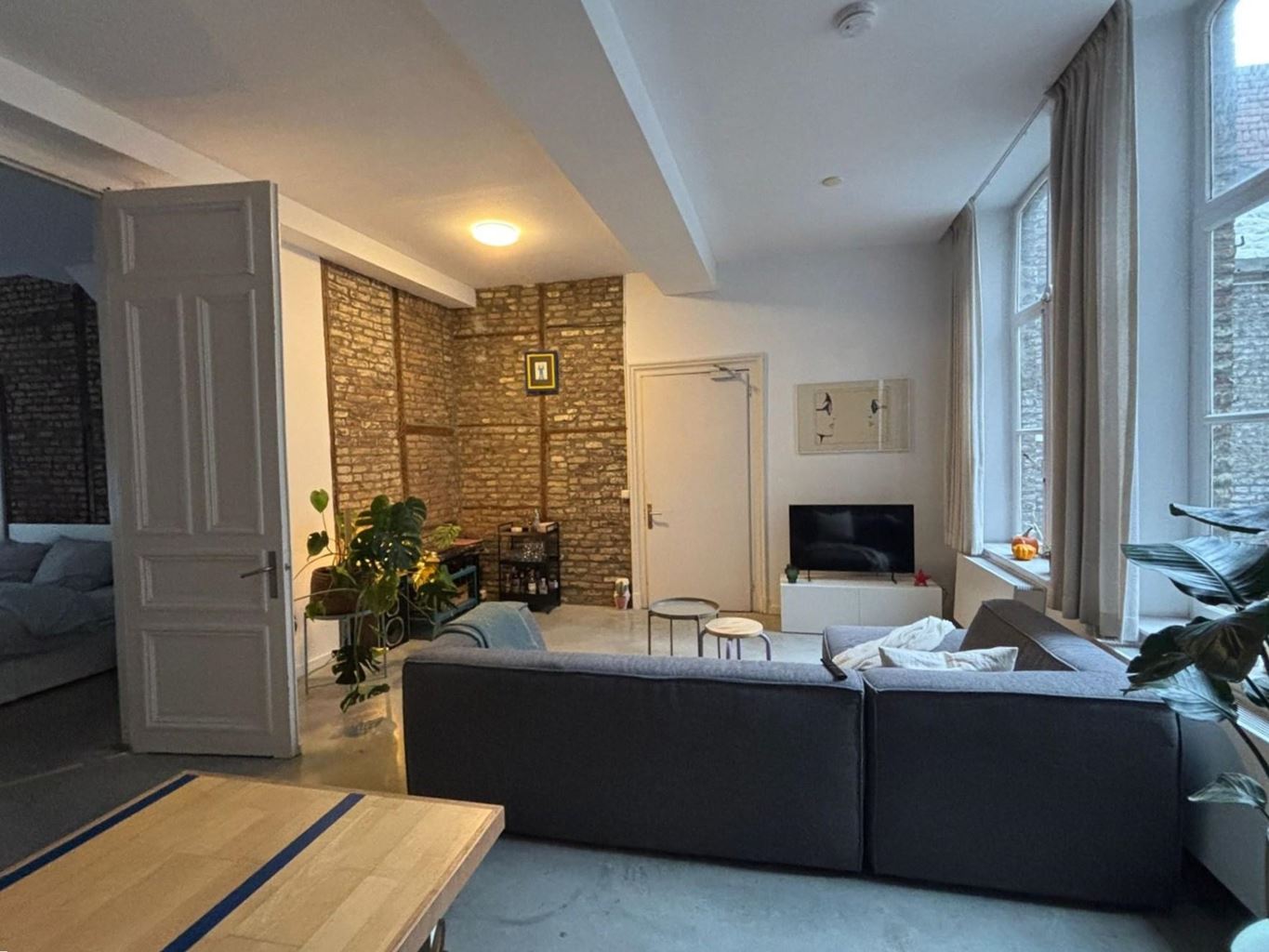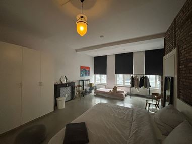 Bij binnenkomst in het appartement betreed je de royale en sfeervolle woonkamer, die direct opvalt door de authentieke details en het ruimtelijke karakter. De hoge plafonds, natuurstenen vloer, karakteristieke schouw en de grote raampartijen aan de voorzijde zorgen voor een lichte en aangename leefruimte. De ramen zijn bovendien voorzien van elektrische rolluiken voor extra comfort en privacy. Via grote openslaande deuren staat de woonkamer in verbinding met het slaapgedeelte en is er een directe doorgang naar de keuken.