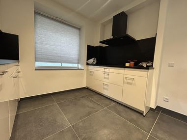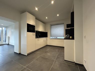 De moderne open keuken is voorzien van diverse inbouwapparatuur, waaronder een 4-pits inductiekookplaat, vaatwasser, afzuigkap, spoelbak en koelkast.