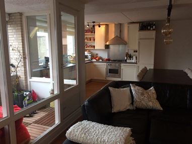 De ruime en lichte woonkamer van circa 34 m² vormt het hart van de woning en is afgewerkt met een laminaatvloer. Dankzij de grote raampartijen geniet deze ruimte van veel natuurlijke lichtinval, wat zorgt voor een aangename en open sfeer. De woonkamer staat in directe verbinding met de open, L-vormige keuken, die volledig is uitgerust met onder andere een koelkast, gasfornuis, gasoven, RVS afzuigkap en vaatwasser.