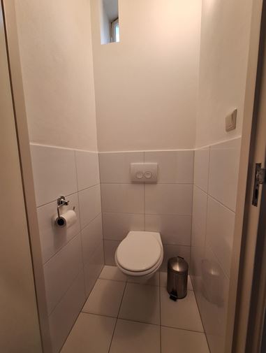 Bij binnenkomst stap je de centrale hal binnen, vanwaar je direct toegang hebt tot de ruime, gezamenlijke keuken. Het privétoilet dat bij de studio hoort, bevindt zich in de hal tegenover de trap.
