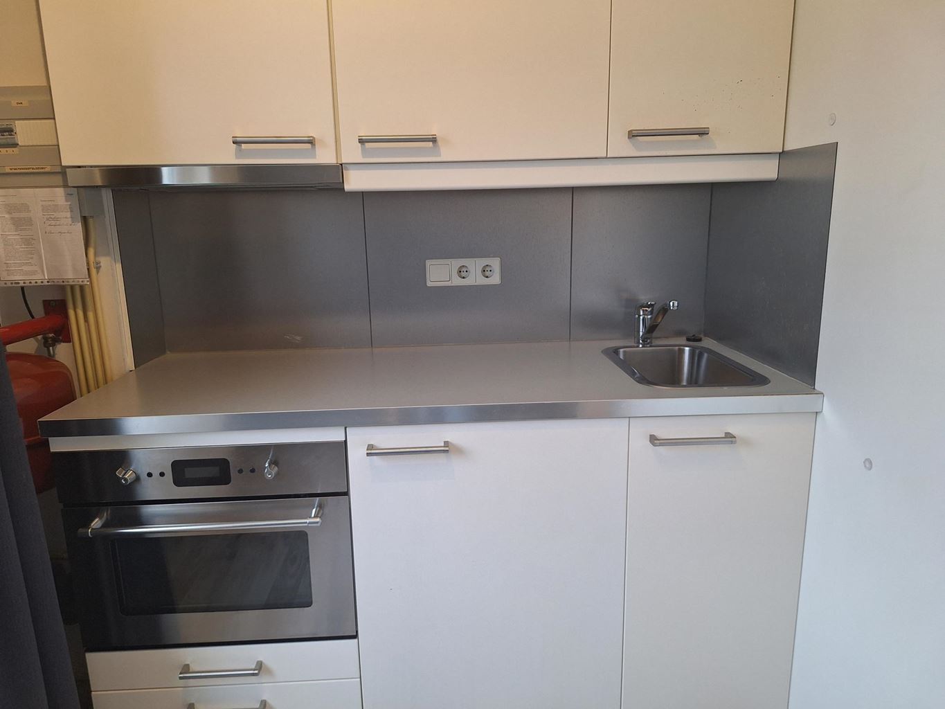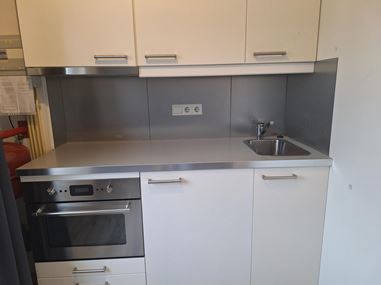 Je komt binnen in een compact halletje dat direct toegang geeft tot het woon-/slaapgedeelte, de keuken en de badkamer. Dankzij het grote raam is de woon-/slaapruimte heerlijk licht.