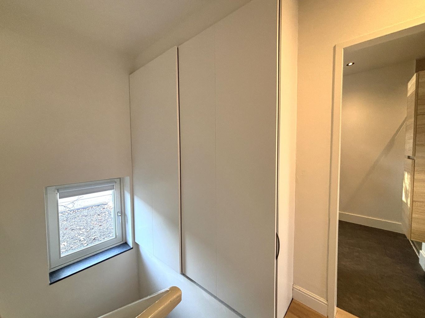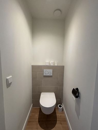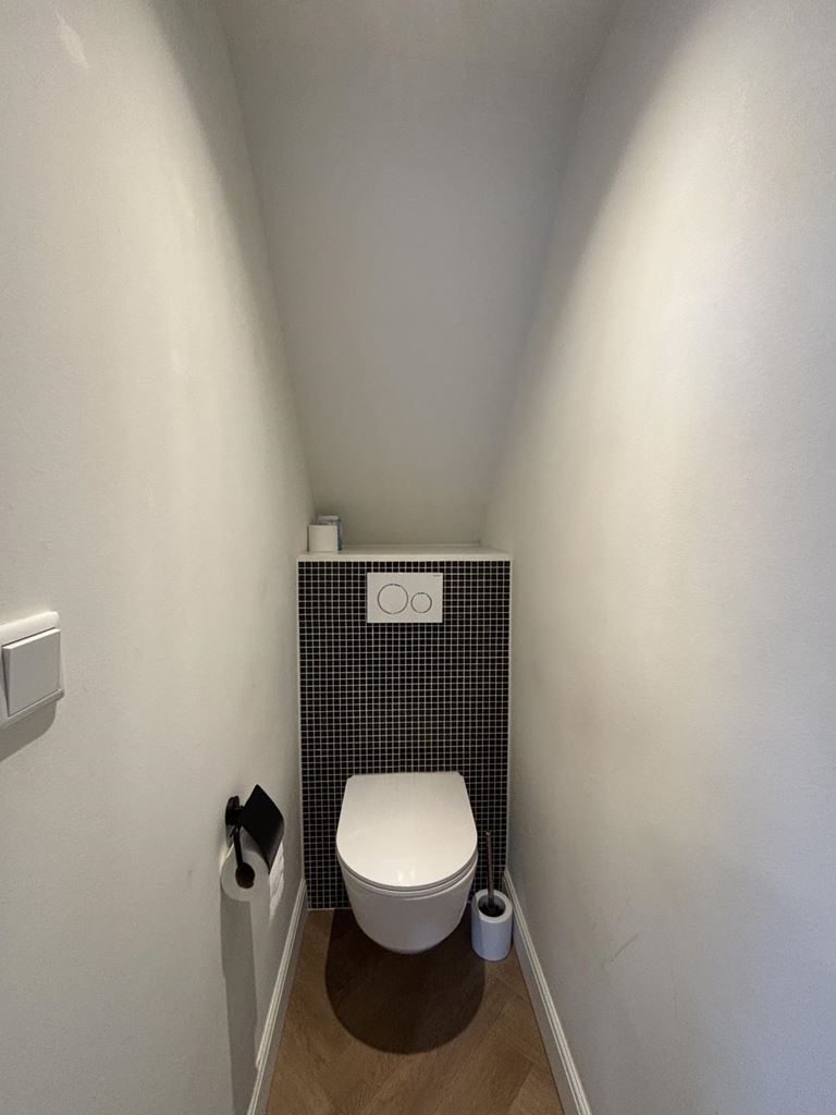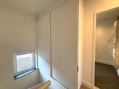 Via de authentieke trapopgang bereikt u de eerste verdieping. De trapopgang beschikt over een praktische ingebouwde muurkast met veel ruimte voor opslag. Op deze verdieping ligt de ruime slaapkamer, die is voorzien van een volledig verzorgde inbouwkast. De badkamer is modern, strak afgewerkt en compleet uitgerust met een ligbad, douche en wastafel. Op de overloop bevindt zich bovendien een separaat toilet.