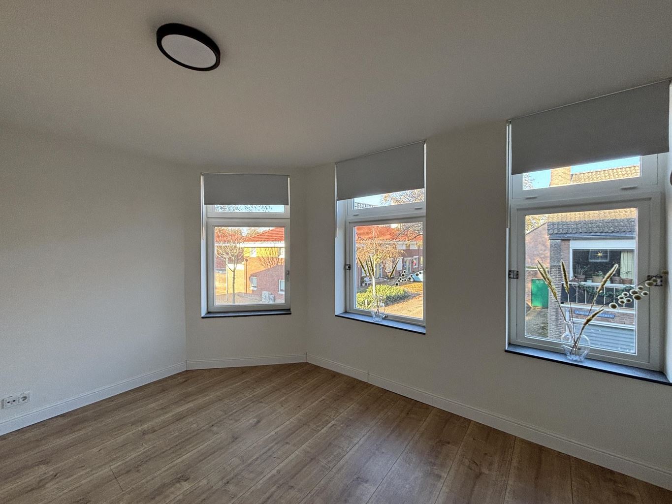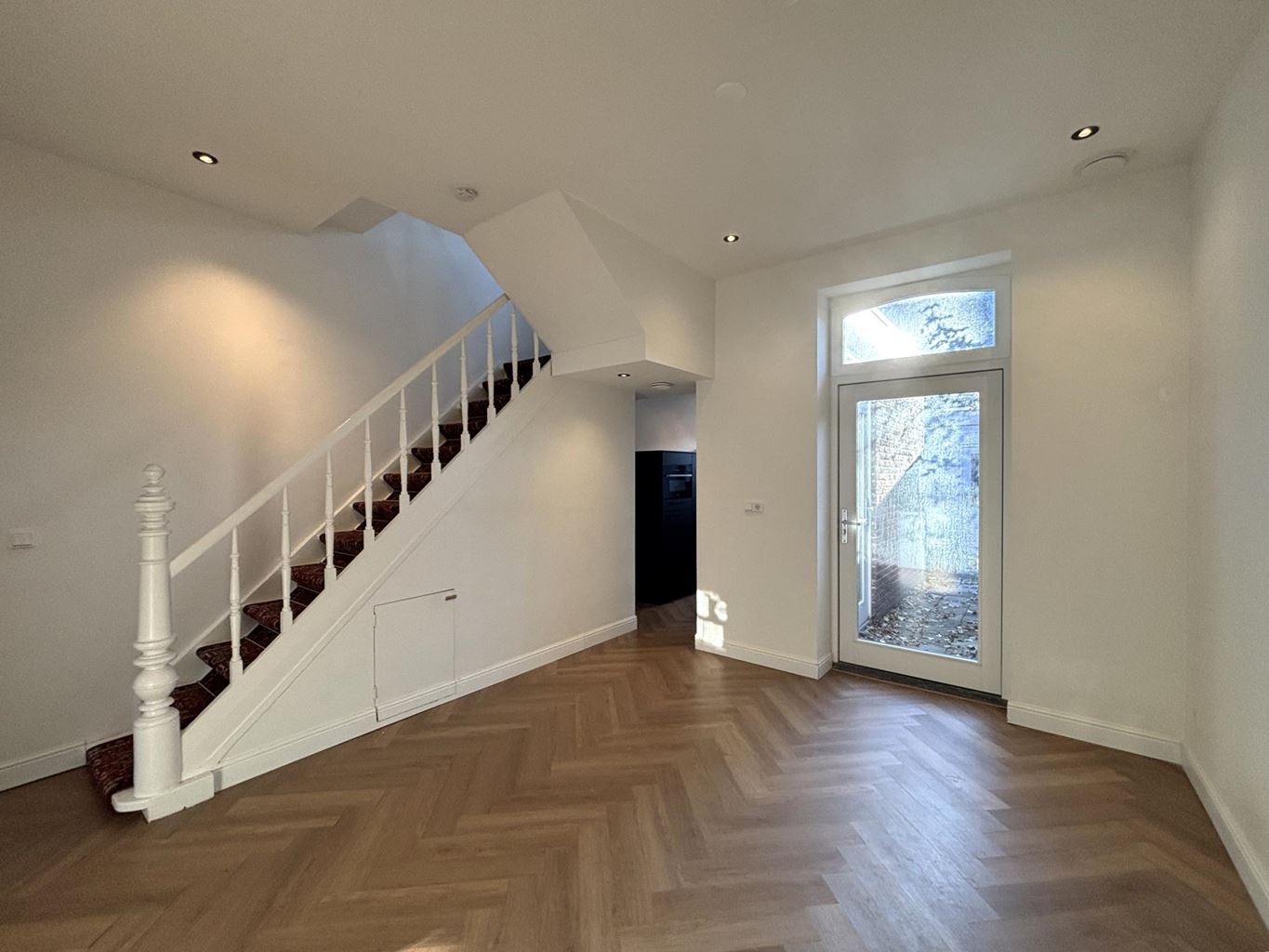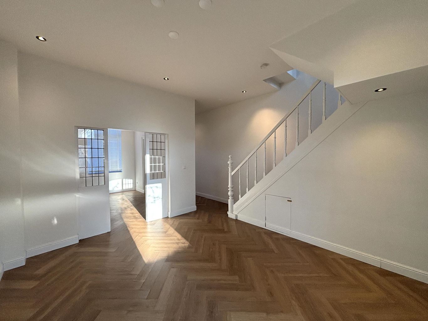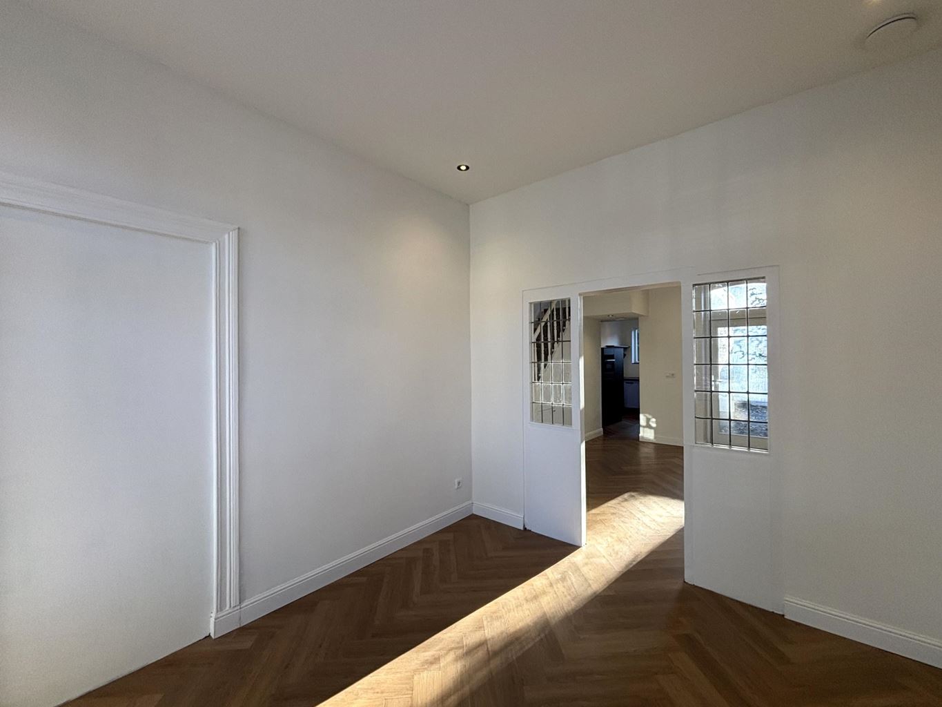Bij binnenkomst treft u een open en uitnodigende ontvangst die direct overgaat in de sfeervolle woonkamer. De woonkamer is verdeeld in twee compartimenten, wat het mogelijk maakt om een comfortabele loungehoek en een aparte eethoek te creëren. De open opzet en grote raampartijen zorgen voor een prettige lichtinval en een aangename leefruimte.