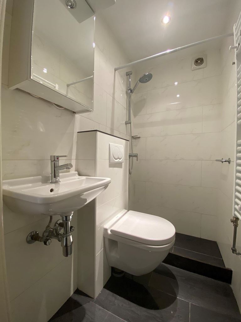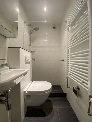Bergkast met cv-installatie. Badkamer met wastafel, toilet en douche.