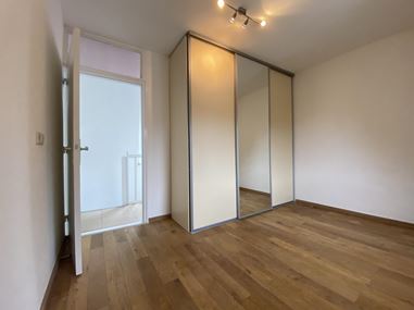 Slaapkamer aan de achterzijde met inbouwkasten en toegang tot de tweede badkamer, uitgerust met wastafel, douche en toilet. Vanuit de overloop trap naar de tweede verdieping.