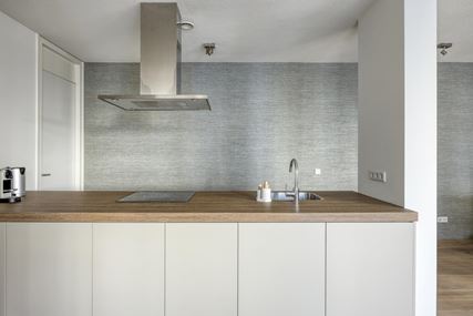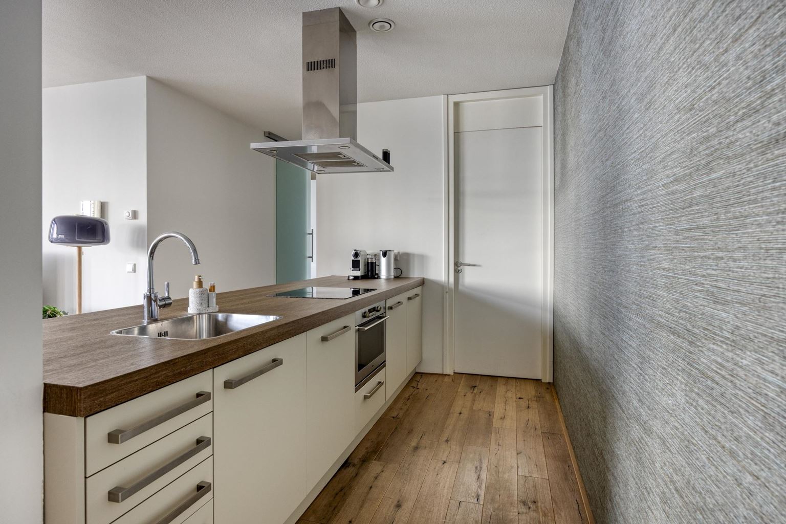 Aansluitend bevindt zich de open keuken, uitgevoerd in een strak en eigentijds design. De keuken is uitgerust met een spoelbak, 4-pits inductiekookplaat, afzuigkap, oven en vaatwasser. Direct naast de keuken ligt een afgesloten bijkeuken met wasmachine, droger en een koelkast met vriesvak.