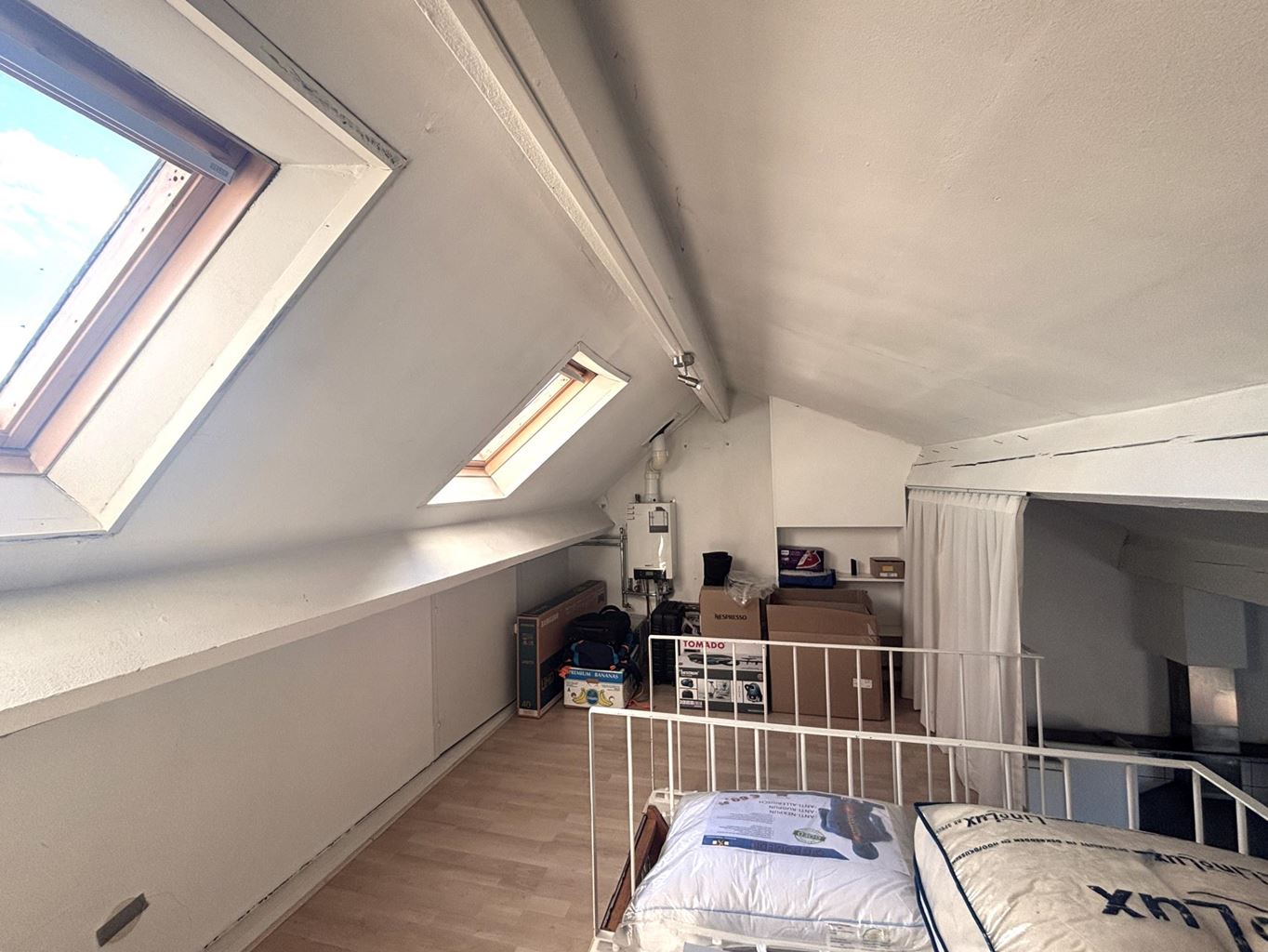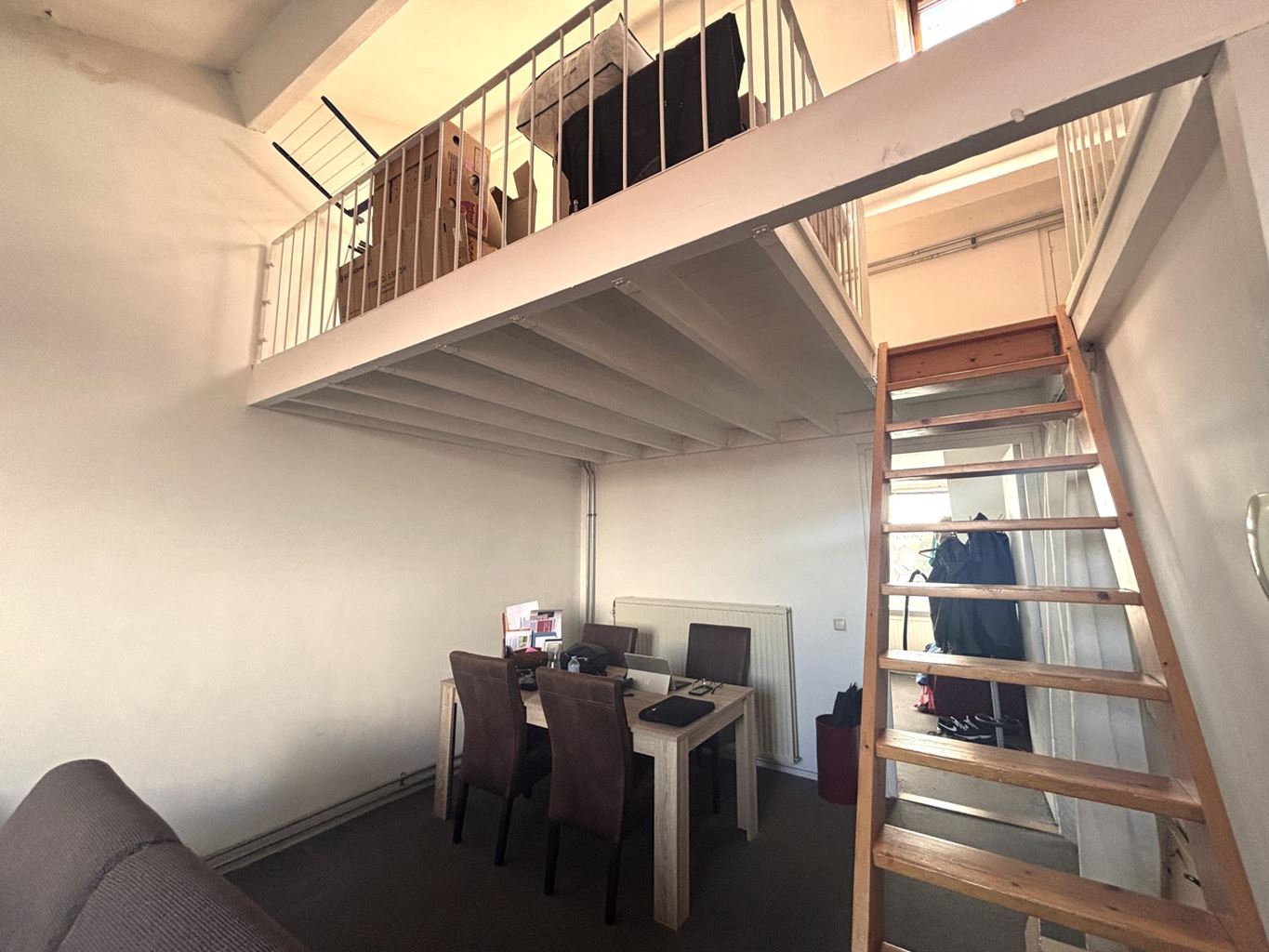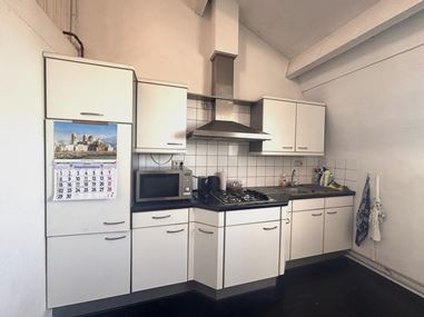 Je komt binnen in een ruime hal die toegang biedt tot de badkamer, het toilet en de woonkamer. De lichte woonkamer bevindt zich aan de voorzijde van het appartement en is verbonden met een praktische keuken, uitgerust met een 4-pits gasfornuis, afzuigkap, koelkast met vriesvak en voldoende kastruimte. Aan de achterzijde van het appartement ligt de slaapkamer, die zorgt voor een rustige en besloten plek. Vanuit de woonkamer leidt een vaste trap naar de zolder, die is ingericht als een open vide.