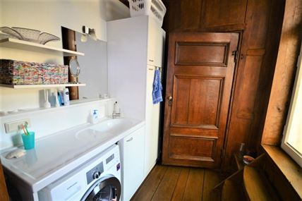 De royale woonkamer aan de voorzijde beschikt over prachtige authentieke vloeren en plafonds, wat direct zorgt voor een karakteristieke uitstraling. Dankzij de grote raampartijen en moderne luxaflex geniet de ruimte van veel natuurlijk licht.