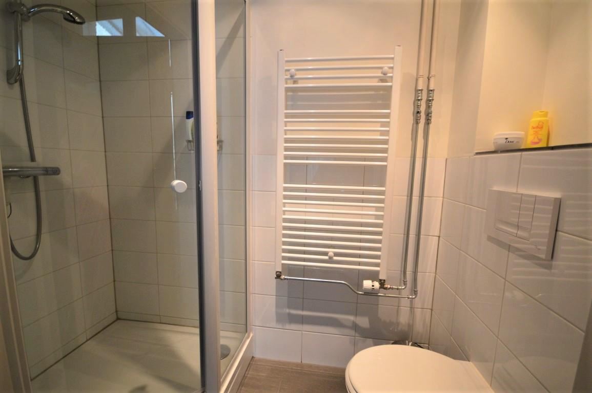 De badkamer is voorzien van een douche, wastafel en toilet en is netjes afgewerkt.