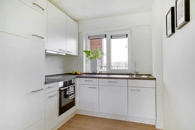 Het 3-kamer appartement heeft een praktische indeling. Via de entreehal komt u in de sfeervolle woonkamer met een moderne en comfortabel ingerichte open keuken. Door de grote ramen kunt u genieten van een bijzonder mooi uitzicht op de stad. De keuken is voorzien van een inductiekookplaat, afzuigkap, combi-oven, koelkast en vaatwasser. Via openslaande deuren komt u vanuit de woonkamer op het ruime, zonnige balkon (4 bij 2,5 meter). Een heerlijke plek voor een kop koffie!
