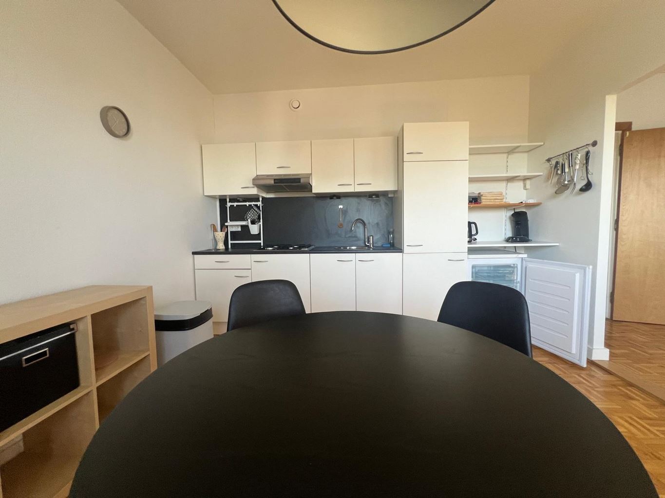 De lichte woonkamer sluit naadloos aan op de open, moderne leefkeuken, uitgerust met een 4-pits gasfornuis, combimagnetron, spoelbak, afzuigkap en een koelkast met vriesvak. De badkamer beschikt over een comfortabele inloopdouche, een stijlvol wasmeubel en een toilet.
