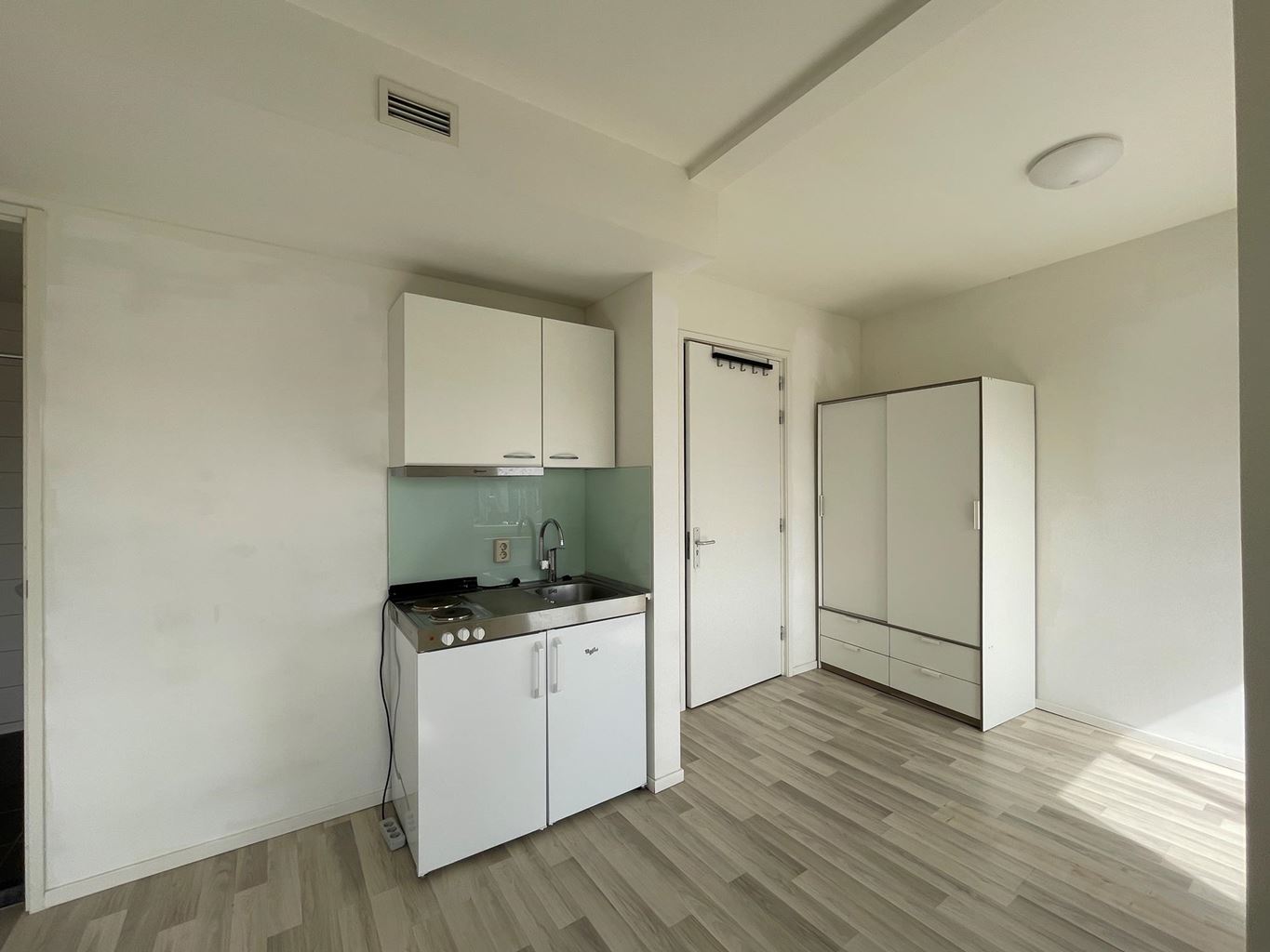 Op de tweede etage is de beschikbare studio gelegen. De studio beschikt over een woon-/slaapkamer met keukenblok, voorzien van afzuigkap, spoelbak, 2-pits elektrische kookplaat en koelkast met vriesvak. De badkamer heeft een douche, wastafel en toilet.