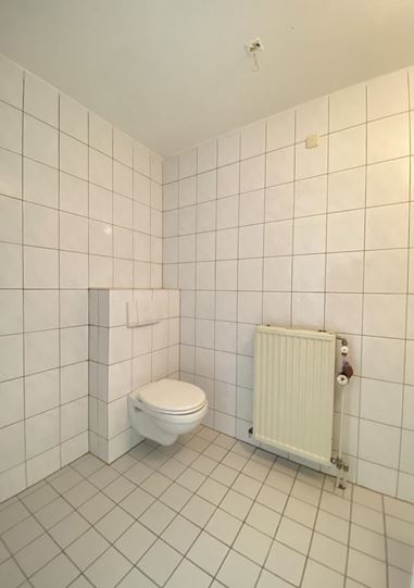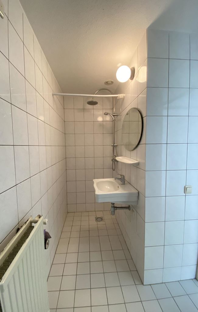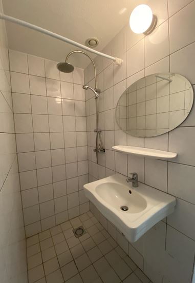 De badkamer bevindt zich naast de entree en is volledig betegeld. Deze is voorzien van een douche, wastafel, toilet en een aansluiting voor de wasmachine.