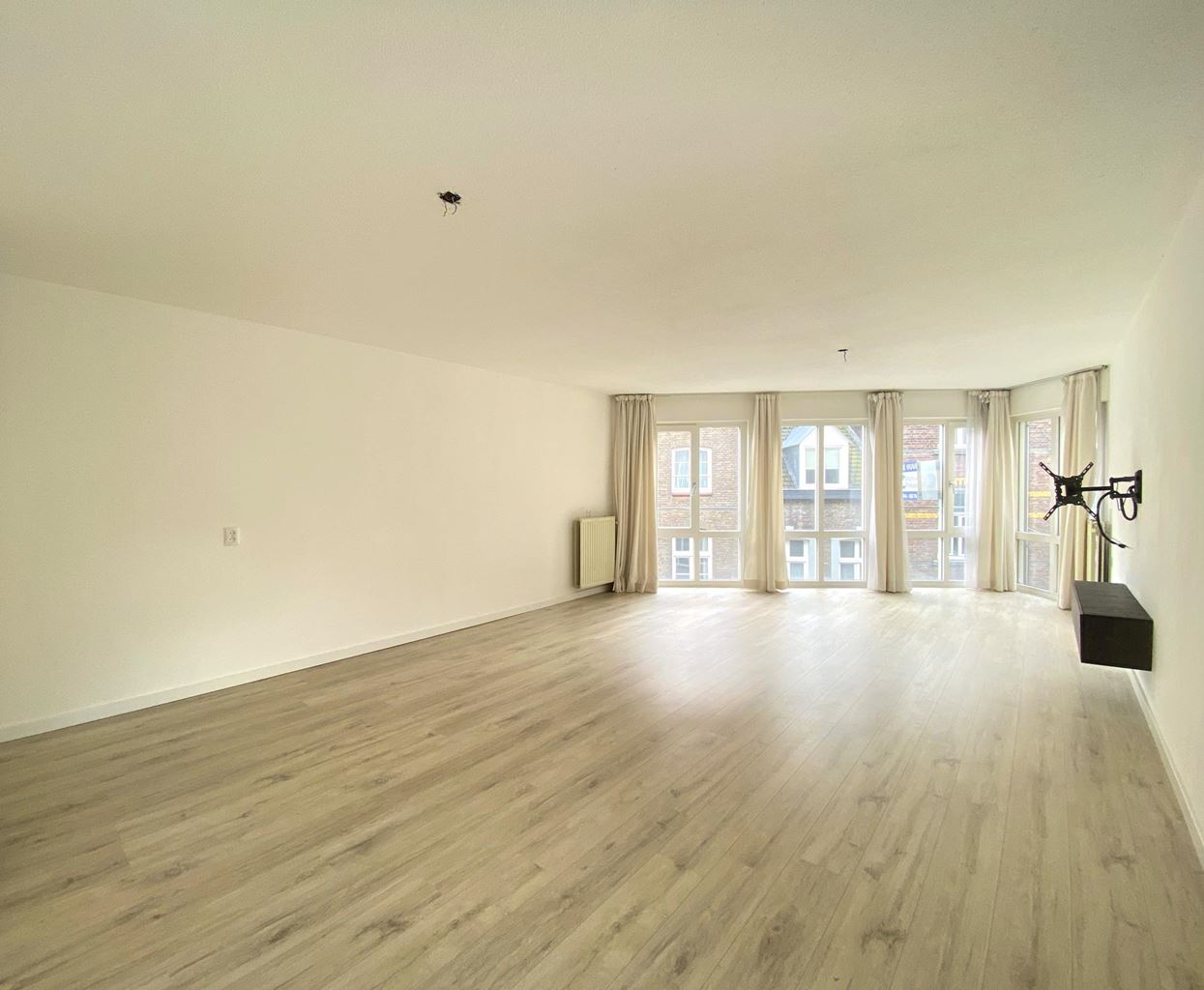 Bij binnenkomst via de hal betreed je het sfeervolle appartement. De lichte woonkamer valt direct op door de grote raampartijen, waardoor het hele appartement geniet van een prachtige natuurlijke lichtinval. Vanuit de woonkamer heb je bovendien een fraai uitzicht op de markt. De ruimte is voorzien van een stijlvol, tijdloos tv-dressoir en een wandbeugel voor de televisie, waarbij alle aansluitingen netjes in de muur zijn weggewerkt. De wanden zijn recent volledig gestuct en opnieuw geschilderd, wat de ruimte een frisse en moderne uitstraling geeft.