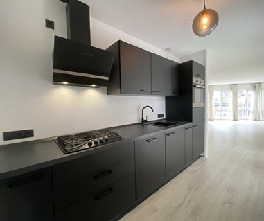 De halfopen keuken is direct vanuit de woonkamer bereikbaar en is recent geplaatst. Deze moderne keuken is uitgerust met diverse inbouwapparatuur, waaronder een combi-oven, spoelbak, afzuigkap, gasfornuis en een koelkast met vriesvak. De zwarte accenten en strakke afwerking zorgen voor een eigentijdse uitstraling. Er is bovendien voldoende kastruimte aanwezig voor al je kookbenodigdheden en voorraad.