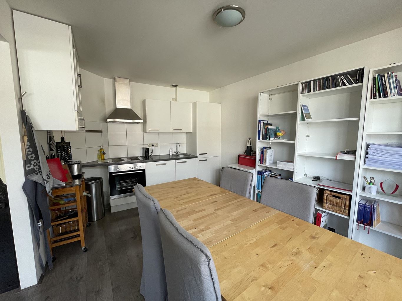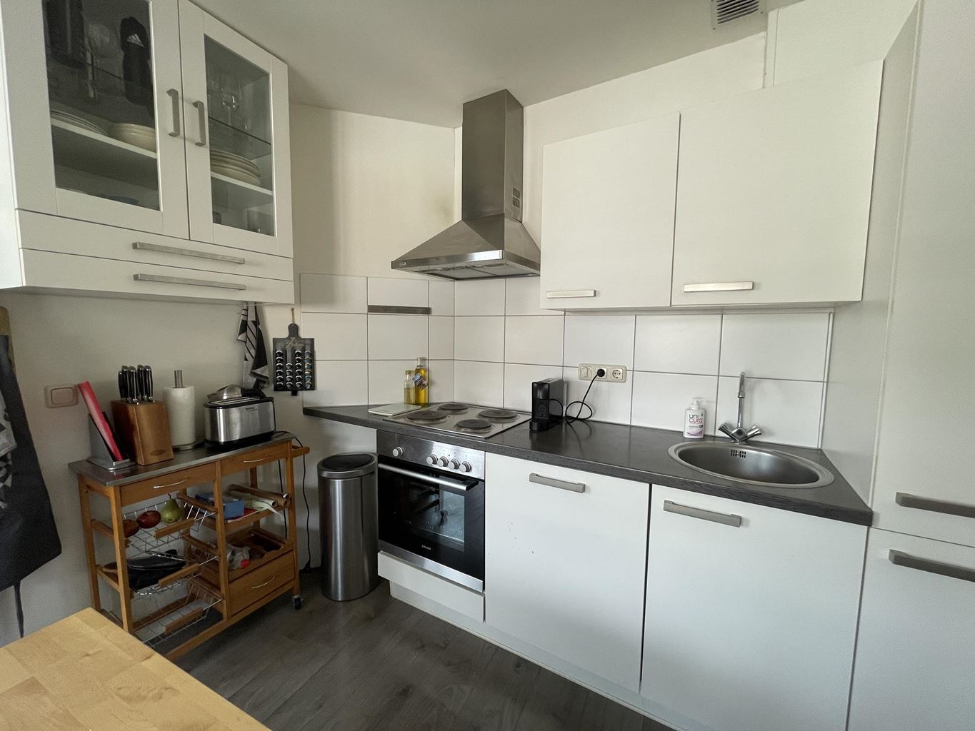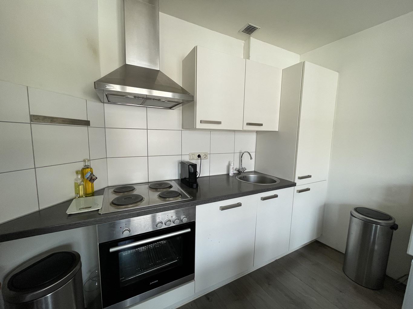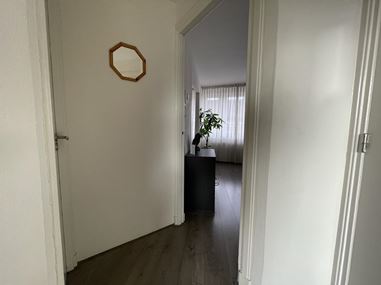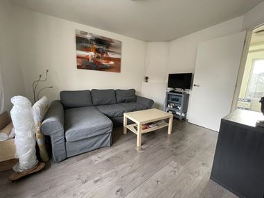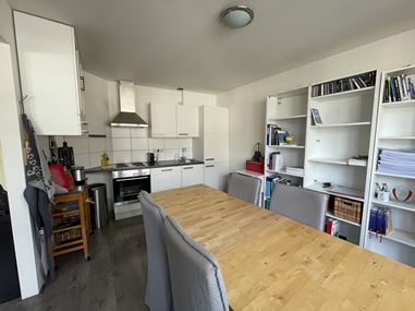 De woonkamer vormt het hart van het appartement en heeft een prettige, open sfeer. Aangrenzend vind je de halfopen keuken, die is uitgerust met diverse inbouwapparatuur en voldoende ruimte biedt om te koken en te leven.
