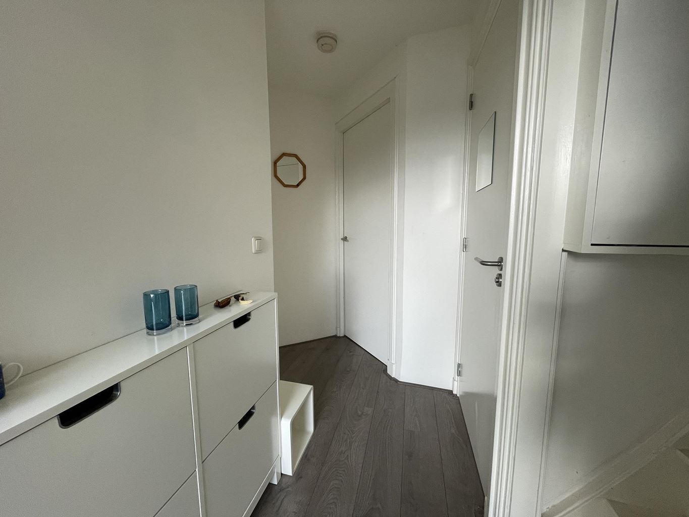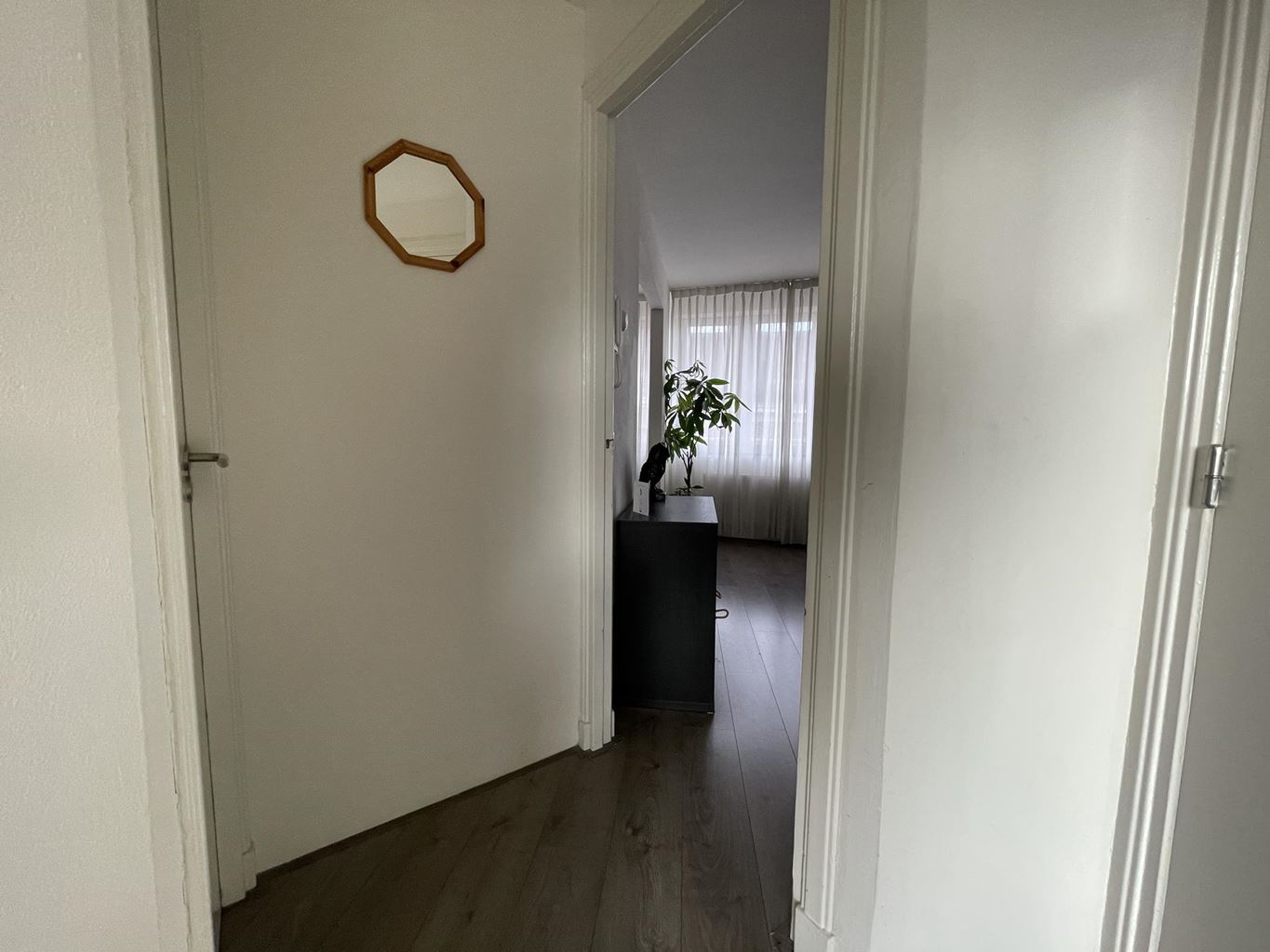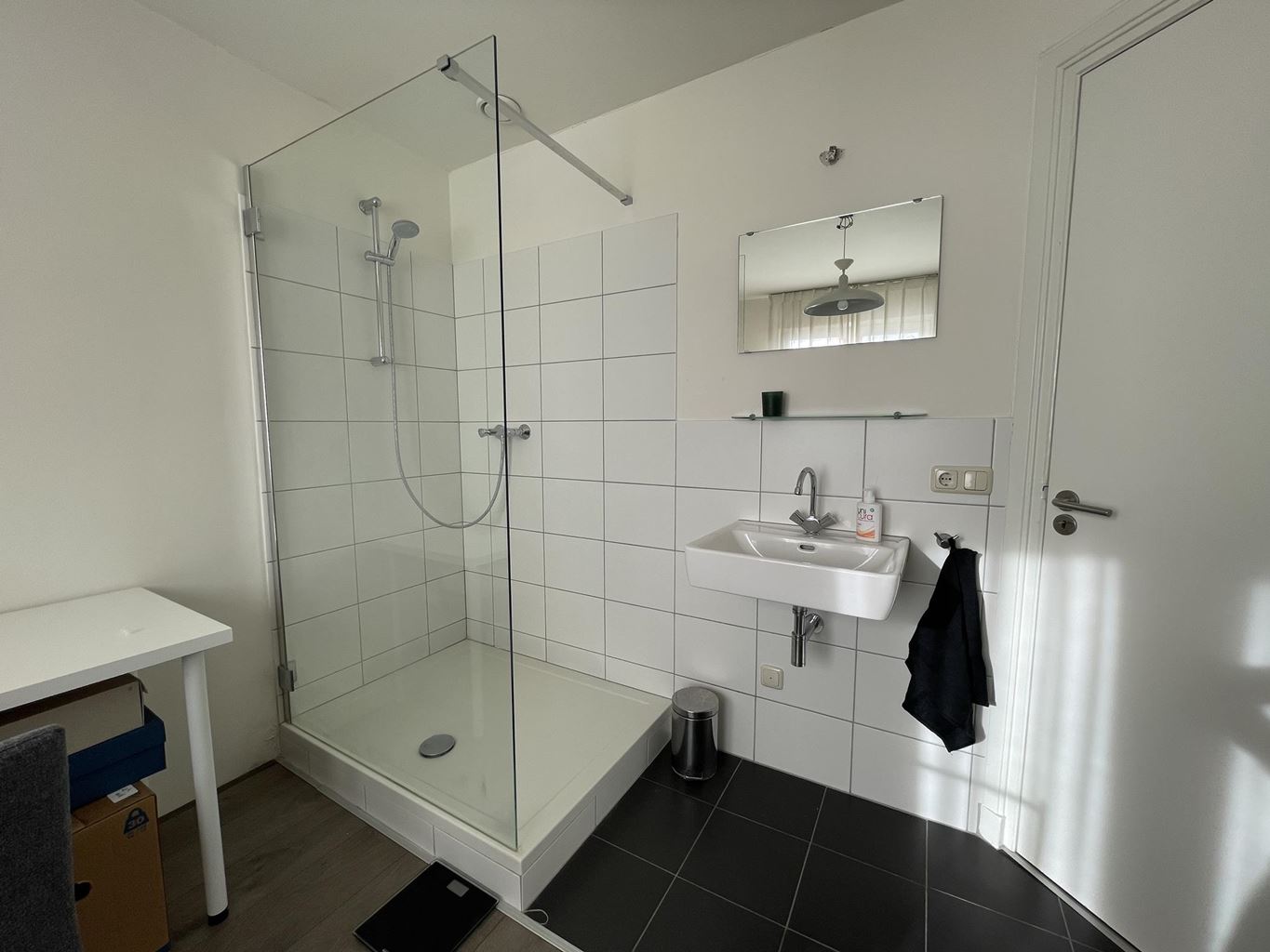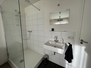 Bij binnenkomst in het appartement kom je in de hal, die toegang geeft tot een separaat toilet met fonteintje. Vanuit hier loop je door naar de verschillende vertrekken van de woning. Aan de achterzijde bevindt zich de slaapkamer, een rustige ruimte die is voorzien van een open inloopdouche en een wastafel, wat zorgt voor extra comfort en gemak.